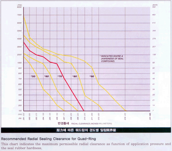Äõµå¸µÀº ¾Ð·Â¿¡ ÀÇÇØ Á÷Á¢ÀûÀÎ ¿µÇâÀ» ¹Þ´Â´Ù. ¾Ð·ÂÀÌ Áõ°¡ÇÏ¸é Æ´»õ°¡ ºÀ¼âµÇ°í, Äõµå¸µ ÀÚ½ÅÀº °í¾Ð¿¡ °ßµô ¼ö ¾ø±â ¶§¹®¿¡, Ȩ°ú ¸é »çÀÌÀÇ Æ´»õ·Î ¹Ð¸²Çö»ó(Extrusion), Âõ±èÇö»ó, ´©À¯ ¹× Á¶±â½ÇÆÐ Çö»ó µîÀÌ ¹ß»ýÇÑ´Ù. ¾Ð·ÂÀÌ Áõ°¡ÇÒ ¶§ QUAD RINGÀÇ ¹Ð¸², Âõ±è, ´©À¯Çö»óÀ» ¹æÁöÇϱâ À§Çؼ Æ´»õ(Clearance) Ä¡¼ö¸¦ ÁÙÀδÙ. Äõµå¸µÀÇ °æµµ(HARDNESS)¸¦ ³ôÀδÙ. »ª¾÷¸µÀ» »ç¿ëÇÑ´Ù. |